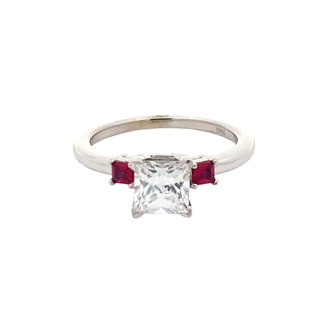 This engagement ring is crafted in 10K white gold and showcases a three-stone design with a princess-cut cubic zirconia center measuring approximately 1.25 carats. The center stone is flanked by two princess-cut lab-created rubies, adding rich color and contrast to the classic silhouette. The clean lines of the princess cuts create a modern, balanced look while maintaining timeless appeal. Designed for everyday wear, this ring offers a striking presentation with durable materials and thoughtful craftsmanship. A beautiful choice for an engagement or meaningful milestone.